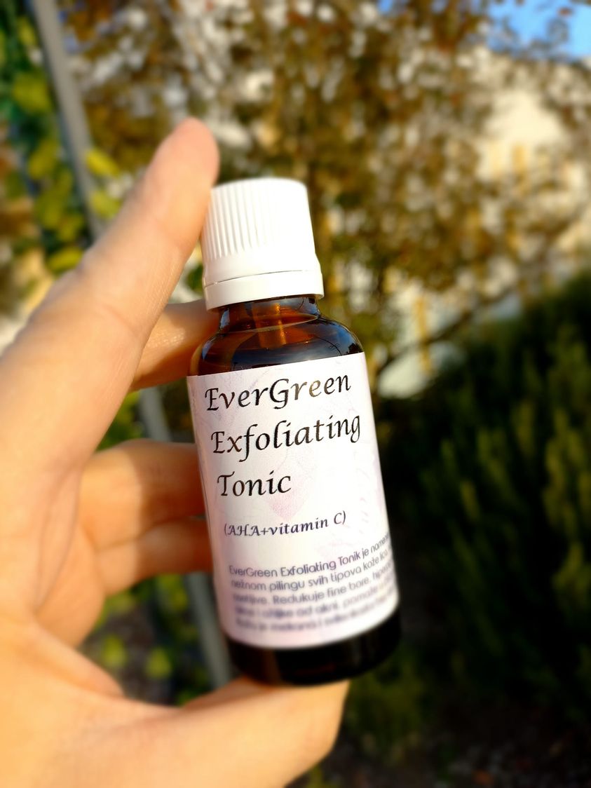 EverGreen tonik za nežni piling lica (eksfolijant) sadrži mandeličnu kiselinu, stabilan oblik vitamina C i hijaluron. Redukuje fine bore, hiperpigmentacije, akne i ožiljke od akni, pomaže u čišćenju pora… Ne iritira kožu (nema crvenila, svraba, peckanja…) zbog čega je namenjen svima, naročito osobama sa osetljivom kožom.