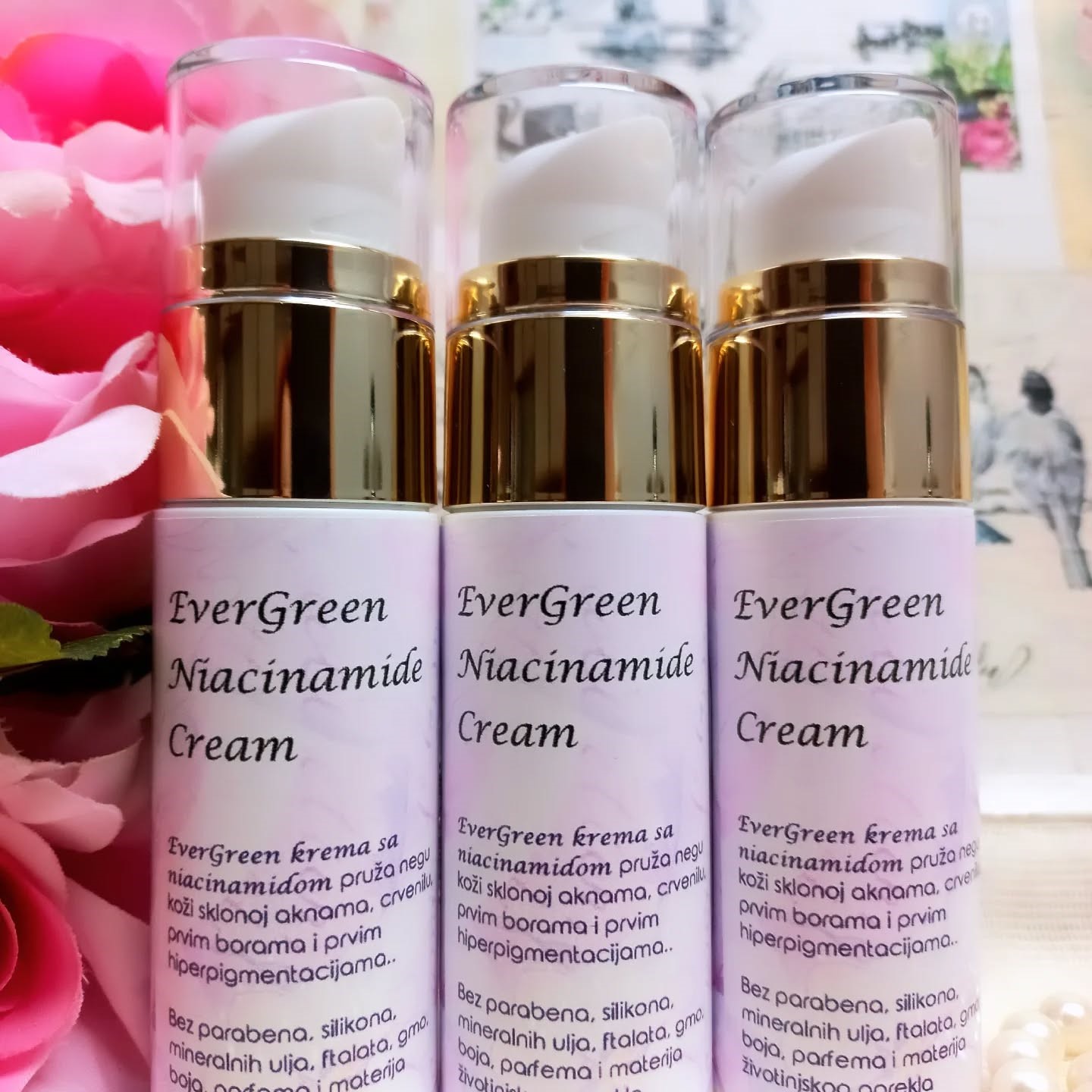 EverGreen niacinamid krema je lagana, hidratantna, nekomedogena. Odlična je nega za osetljivu kožu sklonu crvenilu, aknama, prvim borama, hiperpigmentacijama… Preporučujemo je kao dnevnu kremu za sve tipove osetljive kože (od masne, preko kombinovane i normalne do suve).